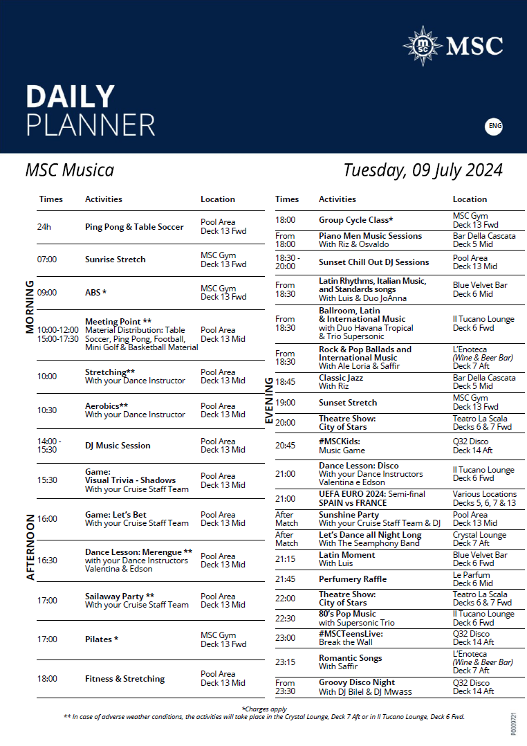 Sve u svemu, hrane ne nedostaje. Stalno imate nešto za jesti i nikad niste gladni, naprotiv. U istom programu vidljivo je i radno vrijeme barova te ostalih usluga. Također, možete vidjeti i brodske preporuke za večernju odjeću. Danas je tema bila sunshine.