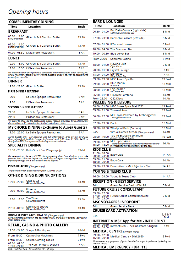 - Doručak je dostupan svakodnevno u buffetu na 13. palubi (self-service) i u dodijeljenom restoranu na 5. palubi (posluženi doručak). Termini su promjenjivi i vidljivi svakog dana za sljedeći dan u njihovom programu na aplikaciji. Buffeti su otvoreni dulje, nekoliko sati, dok doručak u restoranu traje oko sat i pol, tako da ćete uvijek imati gdje nešto pojesti, čak i ako zakasnite.